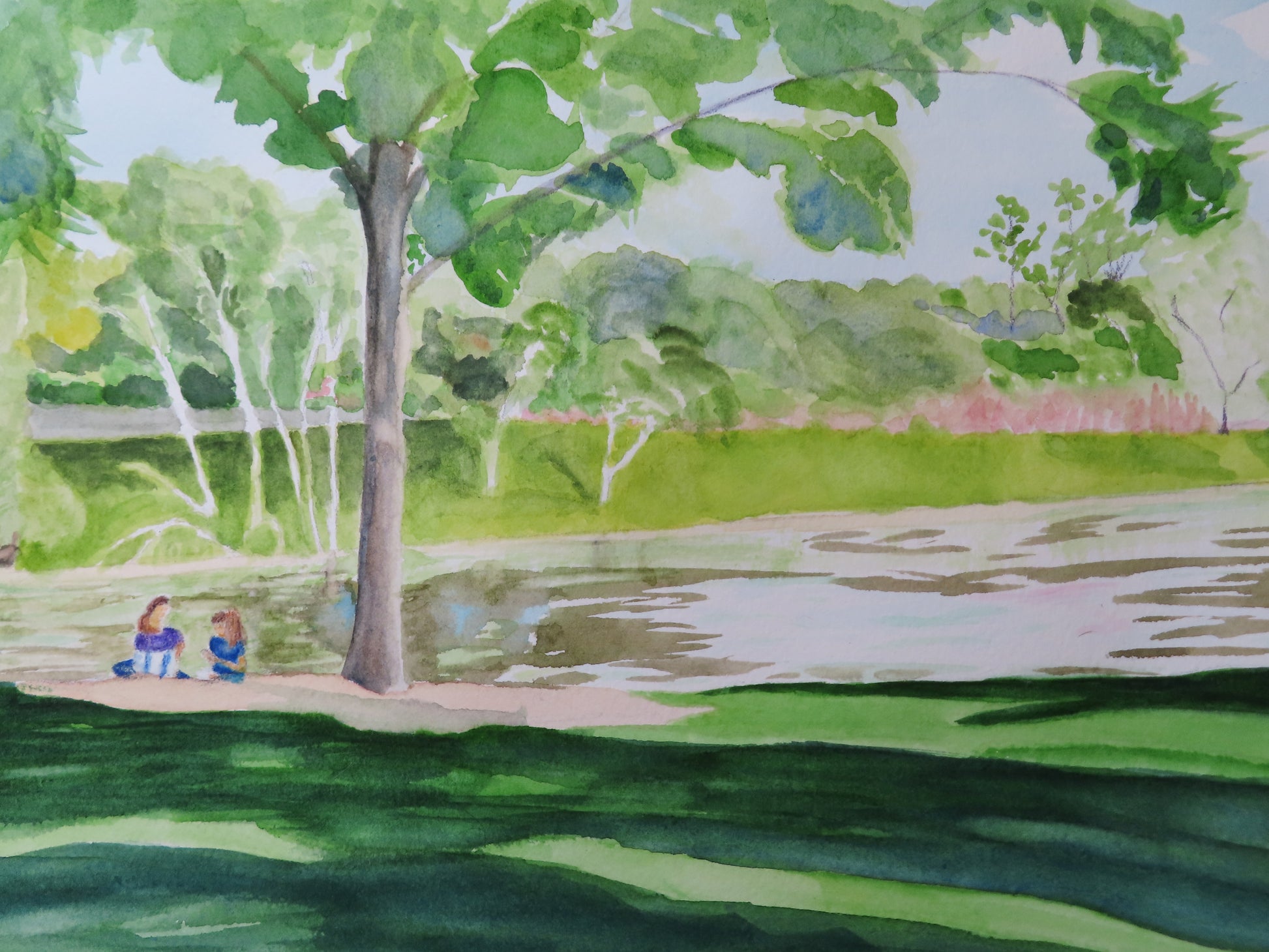 I paint from my photographs. This photograph was taken after a hike in the Grant Woods on a beautiful sunny day. There were was a blue heron perched on a tree near the other pond, we had a wonderful picnic under the shade of the trees, and these 2 friends were visiting at a nearby pond.